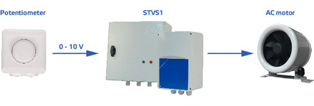 Jedną z prędkości można wybrać za pomocą sygnału wejściowego 0-10 V. Sygnał 0-10 V może być dostarczony przez czujnik lub system zarządzania budynkiem. Sterownik STVS posiada również wyjście 12 V. Podłączając do niego MTP-X10K-NA lub SDP-10K-NA, można zdalnie sterować STVS. Sygnał wejściowy 2 V aktywuje poziom prędkości 1 (110 VAC do silnika), sygnał wejściowy 4 V aktywuje poziom prędkości 2 (140 VAC do silnika) itp.