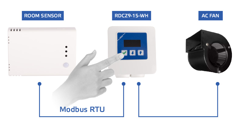 RDCZ lze použít buď jako plně volitelný manuální regulátor otáček AC ventilátoru nebo jako hlavní zařízení v řešeních ventilace na základě požadavku. To, co odlišuje RDCZ, je jeho kompatibilita s HVAC čidly společnosti Sentera. Nyní se rychlost Vašeho ventilátoru dynamicky přizpůsobuje na základě okolní teploty, relativní vlhkosti, koncentrace CO2, kvality vzduchu (koncentrace TVOC) nebo rozdílu tlaku. Tato inteligentní funkce zajišťuje optimální ventilaci přizpůsobenou Vašemu prostředí.