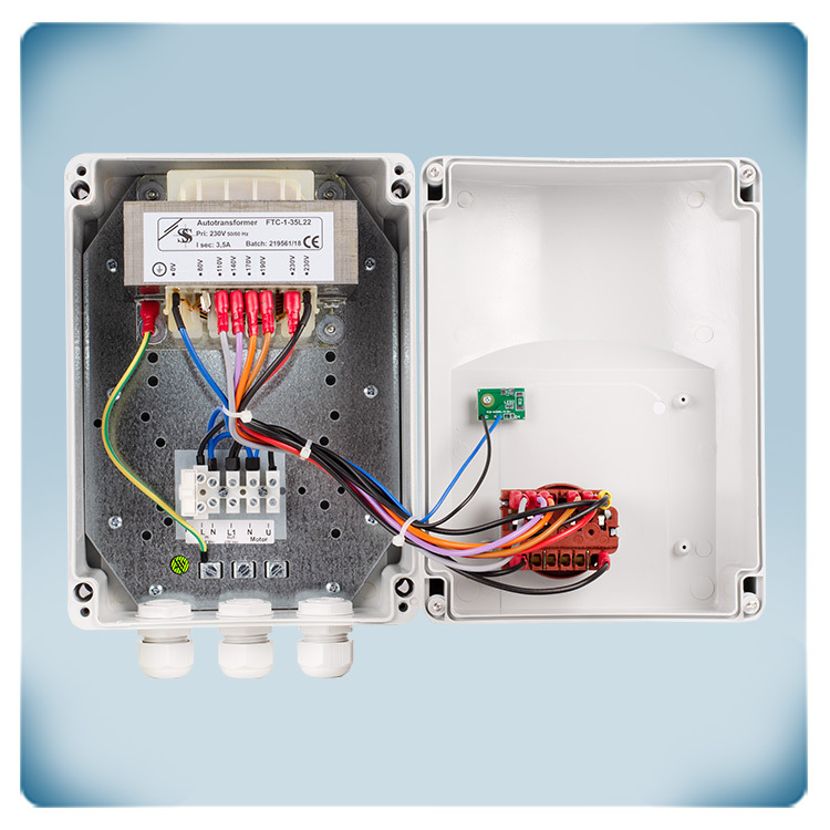 Transformátorový regulátor otáček ventilátoru pro jednofázové motory. Maximální (kombinovaný) proud je 3,5 A. Otáčky střídavého ventilátoru jsou regulovány od nízkých po vysoké v 5 krocích a lze je volit pomocí otočného přepínače. Tento otočný spínač má také polohu OFF. Otáčky motoru se regulují v 5 krocích změnou napětí motoru. Výstupní napětí s dokonalým sinusovým tvarem zaručuje tichý provoz motoru. Kryt poskytuje krytí IP54 proti vniknutí nečistot, prachu a vlhkosti. Lze jej instalovat na stěnu ve vnitřním prostředí. Tento pětistupňový regulátor otáček se často používá k ovládání odsávacích ventilátorů kuchyňských digestoří, stropních ventilátorů, odtahových ventilátorů atd.