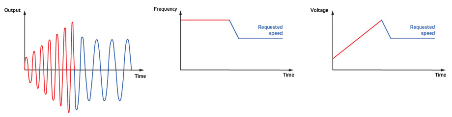 Frequenzumrichter steuern die Motorspannung und die Motorfrequenz über eine Technologie, die Pulsweitenmodulation genannt wird. Diese Technik wandelt die zugeführte Wechselspannung in Gleichspannung um. Ein Frequenzumrichter verfügt über einen DC-Bus, der als Pufferspeicher für die verfügbare Energie angesehen werden kann. Dieser Pufferspeicher wird sowohl durch die Versorgungsspannung (über den Gleichrichter) als auch durch die Rückspeiseenergie des Motors, die beim Bremsen zurückfließt, gefüllt. Diese Gleichspannung wird durch IGBTs wieder in eine Art Wechselspannung umgewandelt. IGBTs oder Insulated Gate Bipolar Transistors sind bipolare Transistoren mit einem isolierten Gate-Anschluss, die einen hohen elektrischen Strom mit hoher Geschwindigkeit schalten können. Dank der intelligenten Steuerung der IGBTs können sowohl die Motorspannung als auch die Motorfrequenz geregelt werden. Dies ermöglicht eine optimale Motorsteuerung und einen energieeffizienten Betrieb.