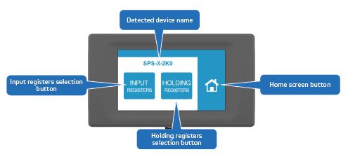 Nach dem Anschluss an das Stromnetz lädt SENSISTANT den Startbildschirm. Durch Drücken der Taste SCAN wird die Suche nach angeschlossenen Geräten gestartet. Nachdem der angeschlossene Sensor/Controller erkannt wurde, werden der Name des erkannten Geräts und die Modbus-Input- und Holding-Register angezeigt. Die Holding-Register können geändert werden, während die Input-Register schreibgeschützt sind.