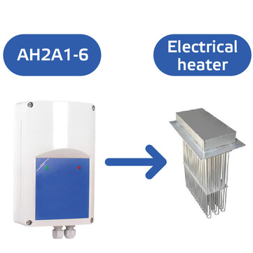 Es können elektrische Heizungen bis zu 3,2 kW (230 VAC) oder bis zu 6 kW (400 VAC) gesteuert werden. Über den Ausgang (0-10 V oder 0-20 mA) dieses Slave-Moduls kann ein weiteres Slave-Modul angeschlossen werden, um die Heizleistung weiter zu erhöhen. Alle Heizungen werden synchron gesteuert.