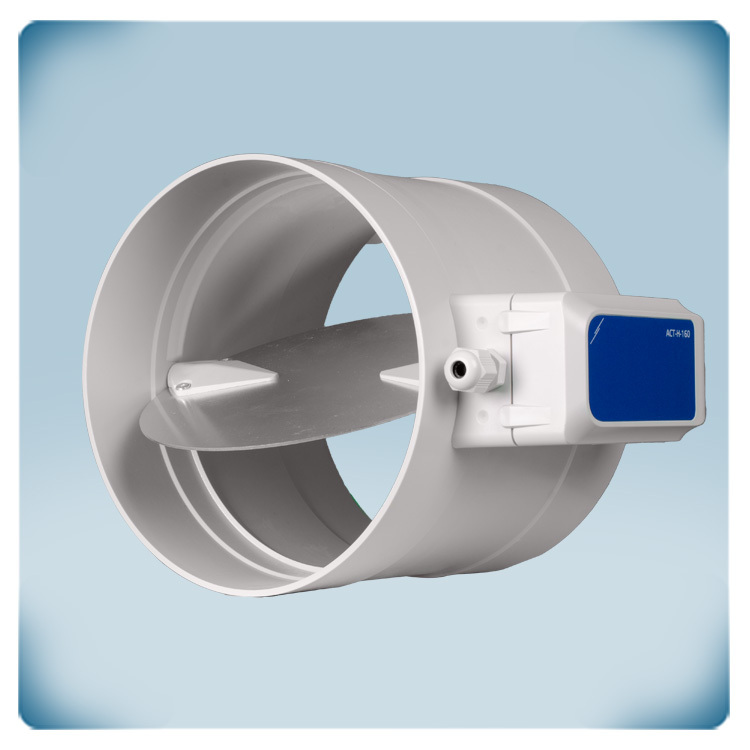 Rundes Volumenstromregelgerät mit eingebautem Stellantrieb für Kanäle mit 160 mm Durchmesser. Bedarfsgesteuerte variabele Volumenstromregelung in Luftkanälen. Die Klappenposition kann über ein 0-10 V-Signal oder über Modbus RTU-Kommunikation eingestellt werden. Die minimale und maximale Position kann über Modbus RTU-Kommunikation eingestellt werden. Der Volumenstromregler bietet eine Luftdichtheit der Klasse D (EN1751). Er kann Luftströme mit einer Geschwindigkeit zwischen 0 und 10 m/s regeln. Die Klappe kann über einen UTP Kabel mit 24 VDC Power over Modbus oder über eine Klemmleiste versorgt werden.