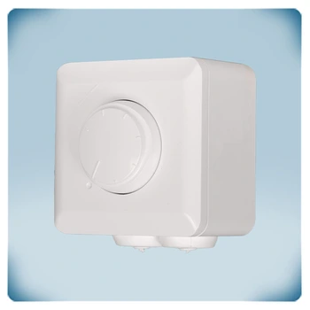 Este potenciómetro sin posición de apagado (OFF) puede controlar ventiladores o regular actuadores eléctricos. Su tensión de alimentación es de 24 VDC. La tensión de salida se puede ajustar a través de un botón giratorio. Por defecto la señal de control es de mínima a máxima, pudiendo cambiarse de máxima a mínima a través del protocolo de comunicación Modbus RTU. Los valores de salida mínimo y máximo y muchos más parámetros también se pueden modificar a través de dicha comunicación. La caja del potenciómetro es adecuada para montaje empotrado IP(44) y montaje en superficie IP(54).