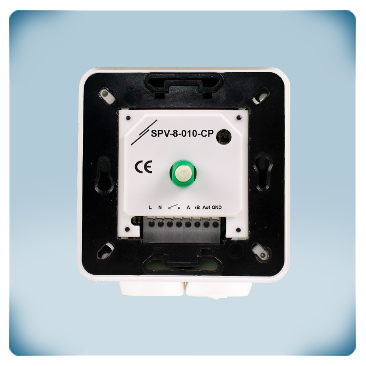 Este potenciómetro se puede usar para una regulación manual de motores EC, reguladores de velocidad de ventiladores AC o actuadores para válvulas o compuertas. Este dispositivo necesita una tensión de alimentación 85 - 264 VAC y genera una señal de salida infinitamente variable, que se puede ajustar a través de un botón giratorio con posición de apagado - OFF. La salida con contactos secos para control ON - OFF remoto de reguladores de velocidad de ventiladores. A través de la comunicación Modbus RTU, se pueden elegir los siguientes modos de salida: 0-10 VDC / 0-20 mA / 0-100 % PWM. En posición de apagado OFF, la salida es 0 VDC / 0 mA / 0% PWM. Los rangos de salida se ajustan mediante la comunicación Modbus RTU. El rango mínimo puede variar del 0% al 40% y el máximo del 60 al 100%. La caja de estos potenciómetros tiene un alto grado de protección, (IP44) para montaje empotrado e (IP54) para montaje en superficie.