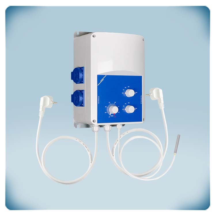 Este es controlador de velocidad de ventiladores AC y elementos de calefacción eléctrica. Este control permite mantener la temperatura constante. Este controlador puede regular motores monofásicos cuyo amperaje no supera 3,5 A y elementos de calefacción eléctrica cuyo amperaje no supera 16 A. La velocidad de los ventiladores AC se puede controlar en 5 escalones. La temperatura ambiente se mide a través de la sonda PT500. La tensión de alimentación para los ventiladores y los elementos de calefacción es separa por medio de dos cables de alimentación con enchufes. Los ventiladores AC y los elementos de calefacción se pueden conectar a través de enchufes tipo Schuco. Ne se precisa hacer un cableado, el regulador es plug & play.