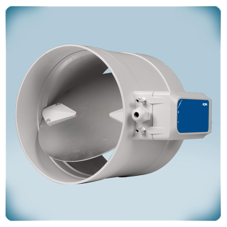 Esta es válvula circular motorizada, que tiene regulador de presión diferencial integrado. La válvula es adecuada para conductos de aire con diámetro de 160 mm.