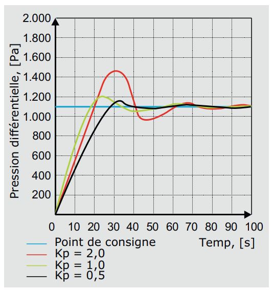 Régulateur de pression différentielle qui dispose de deux points de consigne. Il peut réguler la pression différentielle et de même le débit volumique d'air.