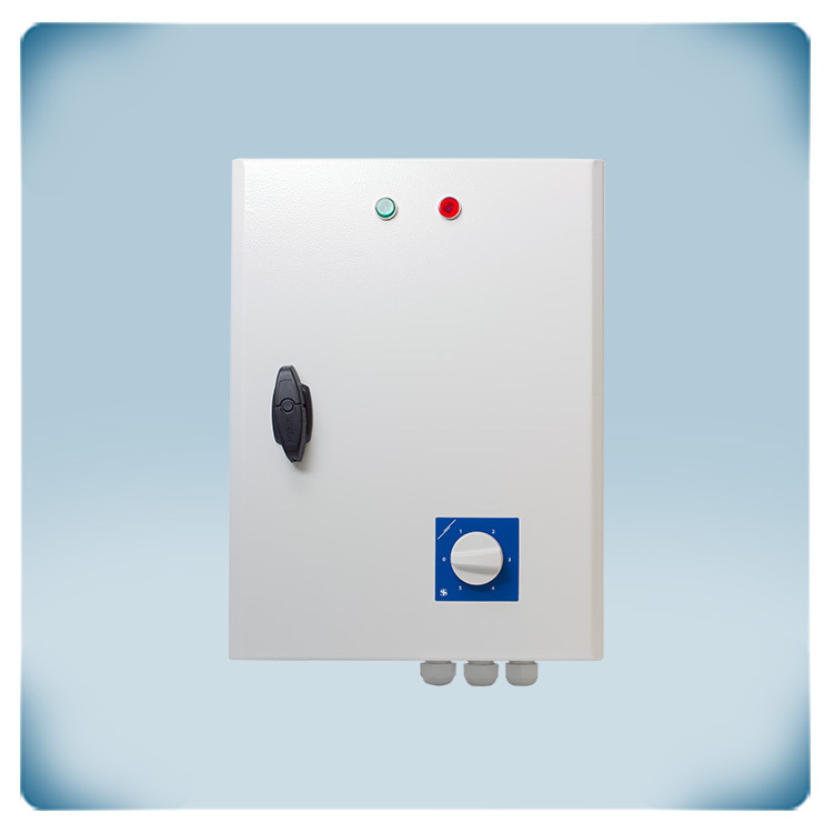 Ces variateurs de vitesse à autotransformateur régulent la vitesse de rotation des moteurs triphasés contrôlables en tension 400 VCA avec un courant maximum de 10 A en étapes en faisant varier la tension du moteur. Ils sont équipés d'autotransformateurs pour contrôler manuellement la vitesse en cinq étapes et disposent d'une surveillance CT pour la protection thermique du moteur et d'un disjoncteur thermo-magnétique intégré. La technologie utilisée fournit une tension de sortie régulée avec une forme sinusoïdale parfaite. La vitesse du ventilateur peut être réglée manuellement en 5 étapes via le bouton intégré. Ce bouton a également une position d'arrêt. Via les entrées numériques, il est possible de connecter un interrupteur ou un thermostat pour générer une commande marche / arrêt à distance. L'appareil dispose également d'un redémarrage automatique après une panne de courant, d'une sortie d'alarme et une sortie non-régulée qui peut être utilisée pour connecter une vanne, un voyant de fonctionnement, un registre, etc. Le boîtier est conçu pour un montage en surface dans des environnements intérieurs (IP54). Prises de tension disponibles: 0-130-180-230-300-400 VCA.