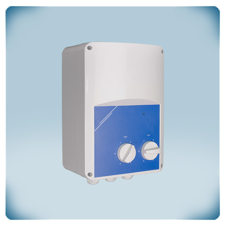 Le SC2-1 est équipé de deux boutons rotatifs pour sélectionner deux vitesses différentes (haute / basse). Au moyen d'un contact sec dans le variateur de vitesse, un interrupteur ou une horloge peut être lié pour passer manuellement ou automatiquement du régime haut au régime bas.