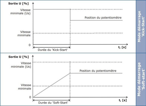 Le variateur détecte automatiquement l'alimentation électrique entre 110-240 VCA / 50-60 Hz. La vitesse minimale est réglable de 30 % à 60 % via un trimmer interne.