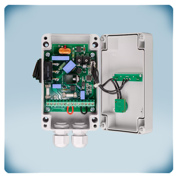 La vitesse minimale et la vitesse maximale sont ajustables via des trimmers internes, qui donnent la possibilité d'affiner les performances. Une sortie non régulée est également incluse pour garantir l'alimentation de dispositifs supplémentaires tels que des vannes ou des lampes.