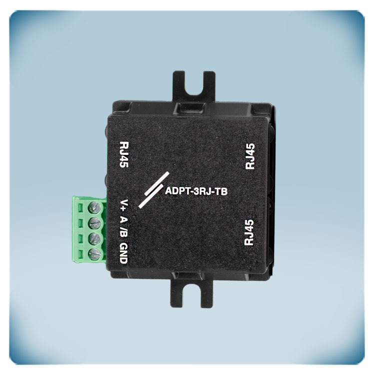 Adattatore da morsettiera a RJ45 per reti Modbus RTU. La morsettiera è collegata a 3 prese RJ45.