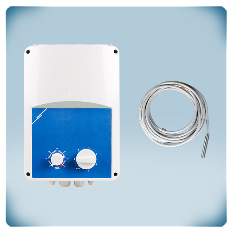 5-standenregelaar voor luchtverhitters met eenfasige motor. De AC-ventilatorsnelheid wordt handmatig of automatisch geregeld. In automatische modus wordt, zodra detemperatuur onder de ingestelde waarde zakt, via de niet-geregelde uitgang de warmwaterklep geopend of het elektrisch verwarmingselement aangestuurd. Hoe groter het verschil tussen de gemeten en ingestelde temperatuur, hoe hoger de snelheid van de AC-ventilator. De ventilatorsnelheid wordt in 5 stappen geregeld. De maximale motorstroom is 2,5 A.