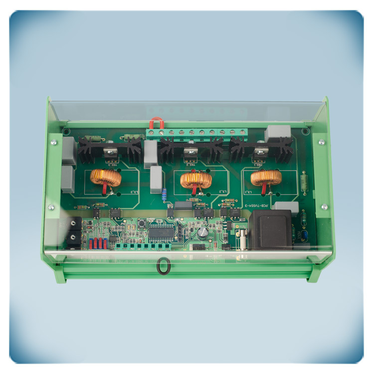 3-Fase 400 VAC elektronische snelheidsregelaar, Imax 3.0 A / fase. Analoge ingang voor 0-10 Vdc of 0-20 mA in oplopende of aflopende modus. Minimum- en maximum uitgang alook het Off-level zijn instelbaar. AAN/UIT van op afstand mogelijk. TK ingang voor thermische motorbeeiliging. Controle LED voor inbedrijfsindicatie. Communicatie en instellingen via Modbus RTU. DIN-rail bevestiging en aanrakingsveilige bescherming.