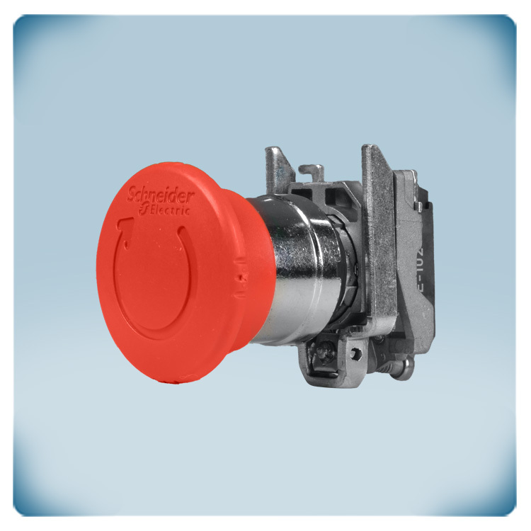 Na het indrukken van de noodstopknop opent het normaal gesloten contact en wordt de elektrische stroom gestopt. Om te resetten of het contact opnieuw te sluiten, moet de knop gedraaid worden. Na deze reset wordt het contact gesloten en wordt de stroomvoorziening hersteld. Deze knop is een van de onderdelen van de ventilatorsnelheidsregelaars SER-1. In deze toepassing wordt hij gebruikt voor rookverwijdering. Na het indrukken van de noodstopknop versnelt de ventilator naar de maximale snelheid om rook te verwijderen.