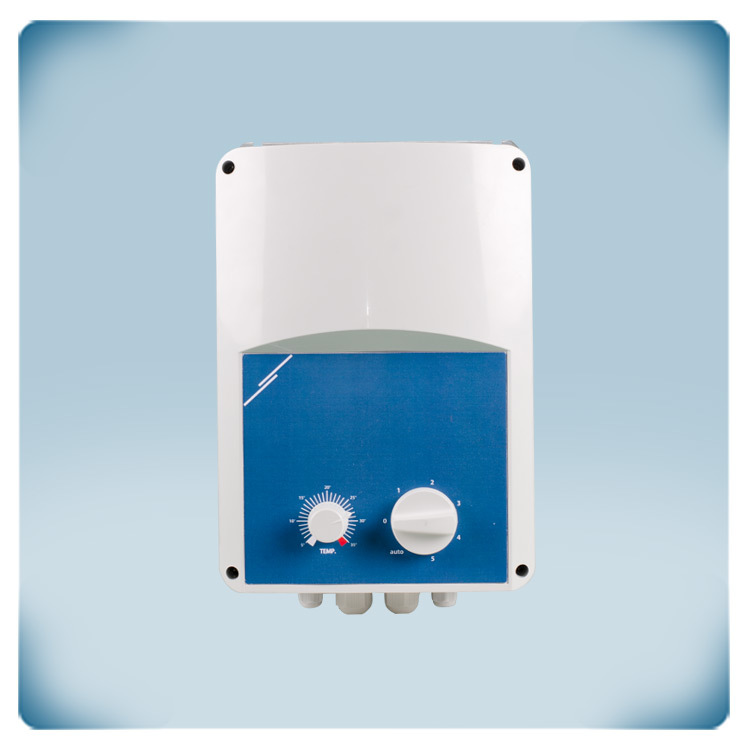 Deze 5-standen ventilatorsnelheidsregelaar werkt op basis van temperatuur. Hij stuurt eenfasemotoren aan. De (gecombineerde) maximale stroom is 2,5 A. Er dient een externe PT500-temperatuurvoeler op aangesloten te worden. Met de niet-geregelde uitgang kan een externe klep voor warmwatervoorziening aangestuurd worden. In de verwarmingsmodus worden de ventilator en de niet-geregelde uitgang geactiveerd als de omgevingstemperatuur onder de ingestelde temperatuur zakt. De ventilatorsnelheid kan handmatig of automatisch worden ingesteld. In de automatische modus neemt de ventilatorsnelheid toe wanneer de omgevingstemperatuur verder onder de ingestelde temperatuur zakt. Wanneer de omgevingstemperatuur hoger is dan de ingestelde temperatuur, worden de ventilator en de niet-geregelde uitgang uitgeschakeld. In de koelmodus is de werking omgekeerd. De ventilatorsnelheid wordt in stappen geregeld door de motorspanning te variëren via spaartransformatortechnologie. Deze technologie garandeert een stille motorwerking. De IP54-behuizing is geschikt voor wandmontage binnenshuis.