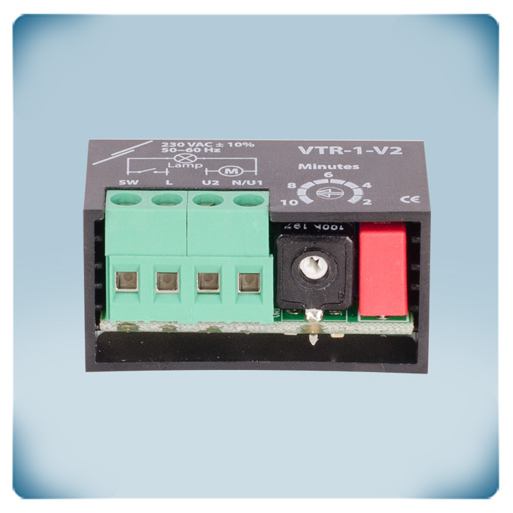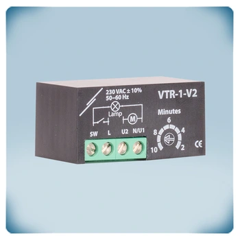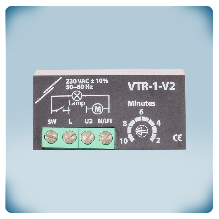 Electronisch tijdrelais met uitschakelvertraging voor ventilatoren. Voedingsspanning 230 VAC, 50-60 Hz. De maximale stroom is 1,5 A. De uitschakeltijd is instelbaar van 2 tot 10 minuten en de aanlooptijd is 1,5 s