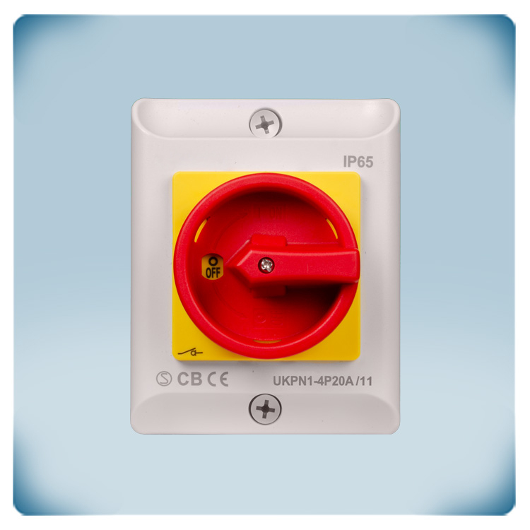Het schakelmateriaal is ondergebracht in een gegoten behuizing met een IP65-afdichting. Deze schakelaar is 4-polig en heeft één normaal open en één normaal gesloten hulpschakelcontact.