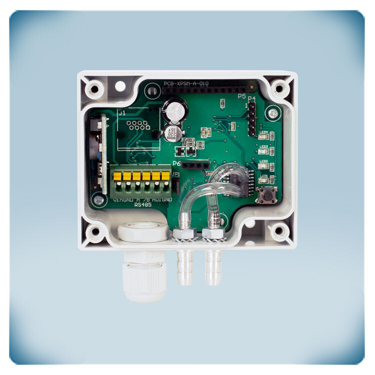 Obudowa wykonana jest z wysokiej jakości tworzywa sztucznego r-ABS VO (UL94). Ten materiał jest odporny na ciepło, bardzo wytrzymały i zapewnia dobrą ochronę przed uderzeniami. Dysze przyłącza ciśnieniowego są wykonane z aluminium. Obudowa czujnika zapewnia stopień ochrony IP65 przed wnikaniem brudu i wody. Ten czujnik można zamontować na ścianie.