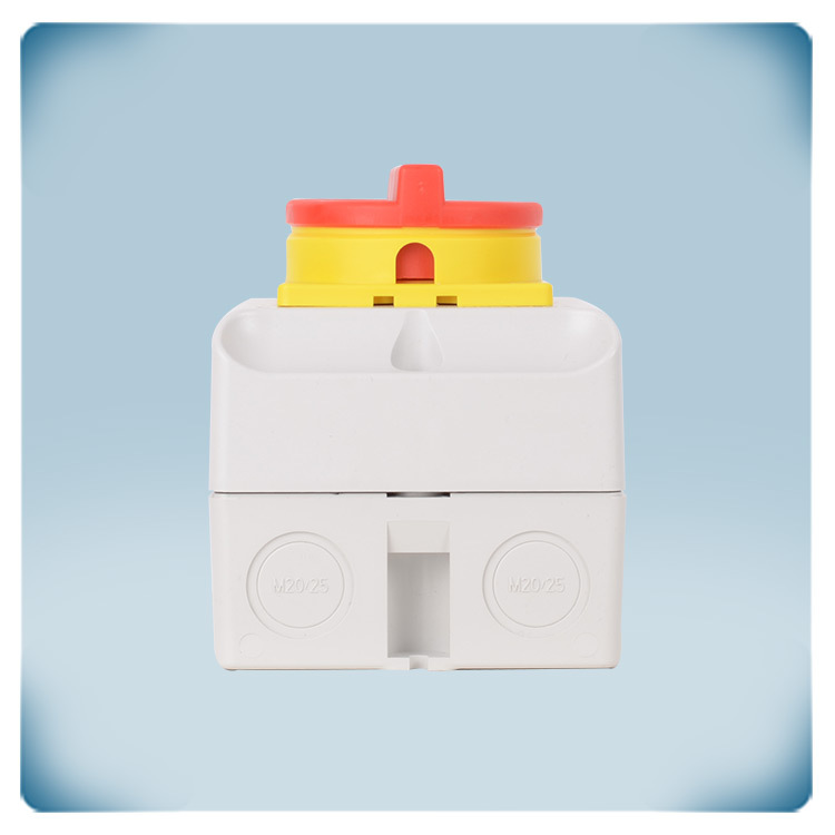 Wysokiej jakości obudowa z tworzywa sztucznego nadaje się do montażu naściennego. Zapewnia stopień ochrony IP65 przed wnikaniem kurzu i wody. Cztery przepusty kablowe M20 lub M25 ułatwiają prowadzenie okablowania. Czerwono-żółty wyłącznik jest dobrze widoczny, co ma kluczowe znaczenie w przypadku wyłączników awaryjnych.