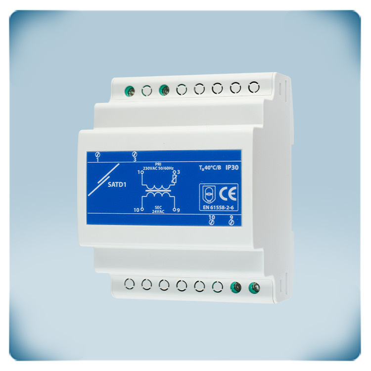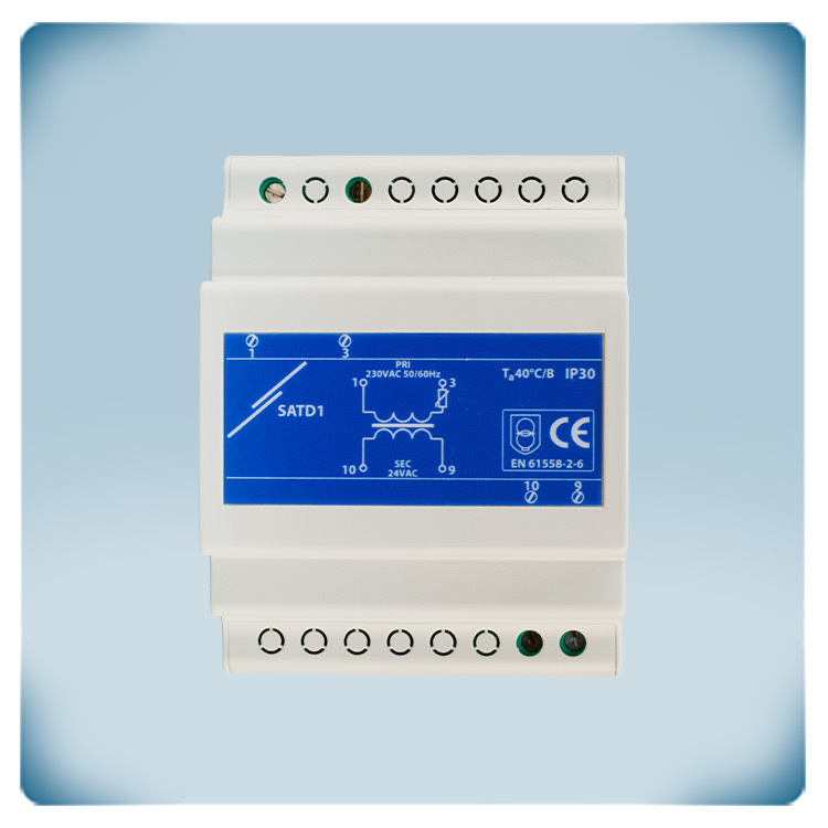 Seria SATD1 doskonale nadaje się do zastosowań, w których wymagane są kompaktowe transformatory separacyjne bezpieczeństwa montowane na szynie DIN ze specyficznymi funkcjami bezpieczeństwa. Pełnią funkcję transformatorowych modułów zasilających podłączanych do sieci zasilającej 230 VAC, które dostarczają do podłączonych urządzeń napięcie wyjściowe 12 VAC ±5% lub 24 VAC ±5%.