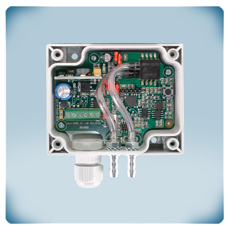 En differenstrycksregulator med två börvärden som reglerar differenstryck eller luftflöde. Matningsspänningen är 24 VAC eller 24 VDC. Den kan användas i intervallet 0 till 2.000 Pa. Den analoga utgången kan direkt styra EC-fläktar, frekvensomriktare eller AC-hastighetsregulatorer. Det begärda differenstrycket hålls konstant oavsett behov. Utgångstypen kan väljas: 0-10 VDC / 0-20 mA / 0-100% PWM. En av båda börvärdena kan aktiveras via torrkontakten. Detta gör det möjligt att till exempel urskilja en dag/nattregim. Båda börvärden och alla andra inställningar kan justeras via Modbus RTU.