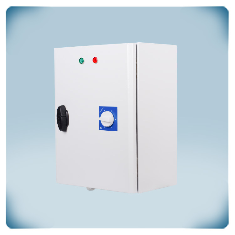 Ett 5-stegs varvtalsreglage för 3-fas 400 V-motorer. En av de fem tillgängliga hastigheterna kan väljas via vridomkopplaren. I nolläge är motorn avstängd. Position 1 är låg hastighet och position 5 är hög hastighet. Fläkthastigheten regleras genom att reducera motorspänningen via spartransformatorer i 5 steg. Denna teknik genererar en utspänning med perfekt sinusform, vilket garanterar tyst motordrift.