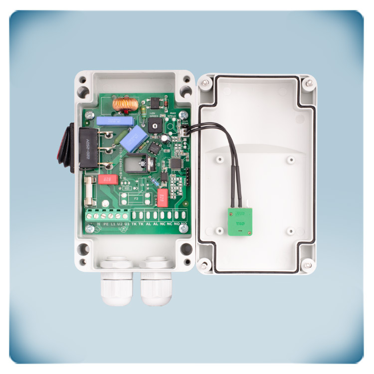 Bu kontrol cihazı, maksimum 1,5 A akıma sahip, tek fazlı, voltaj kontrollü motorlar için tasarlanmıştır. Motor voltajını değiştirmek suretiyle fan hızını, faz açısı kontrolü ile TRIAC teknolojisini kullanarak ayarlar. Cihaz, entegre bir açma/kapama anahtarına sahiptir ve bir jumper aracılığıyla seçilebilen Kick Start ve Soft Start olmak üzere iki başlangıç modu sunar.
