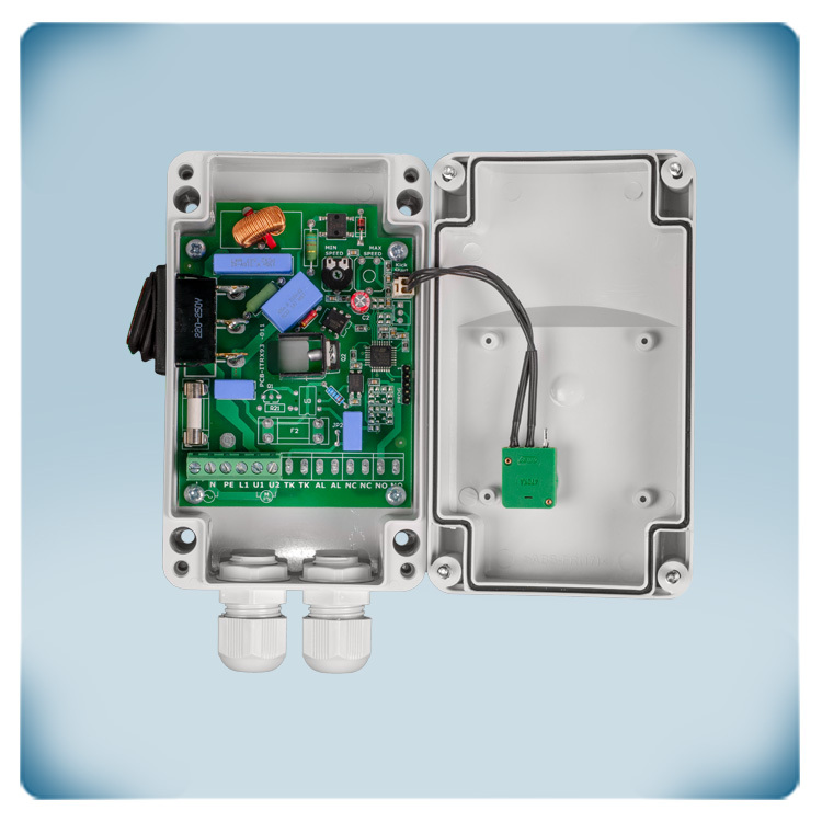 Bu kontrol cihazı, maksimum 3 A akıma sahip, tek fazlı, voltaj kontrollü motorlar için tasarlanmıştır. Motor voltajını değiştirmek suretiyle fan hızını, faz açısı kontrolü ile TRIAC teknolojisini kullanarak ayarlar. Cihaz, entegre bir açma/kapama anahtarına sahiptir ve bir jumper aracılığıyla seçilebilen Kick Start ve Soft Start olmak üzere iki başlangıç modu sunar.