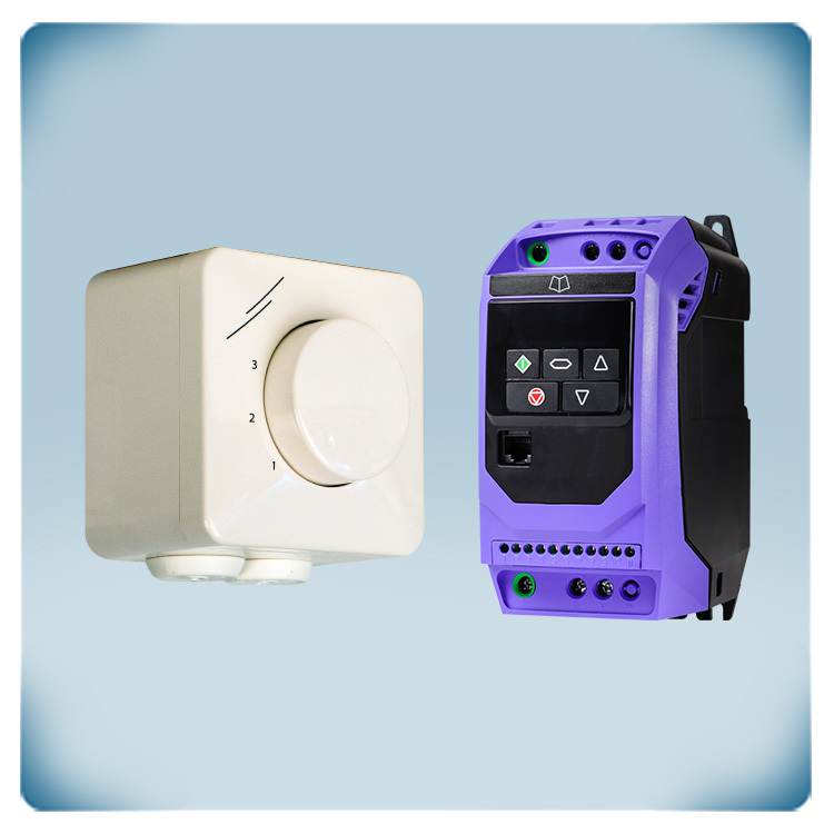 Trifaze 400 Volt motorlar için manuel 3 kademeli hız kontrolü. Maksimum motor akımı 2,2 A'dır. Fan hızı, kontrol anahtarı üzerinden 3 kademeli olarak ayarlanabilir. Kontrol anahtarı, frekans invertörünü 0-10 V sinyal üzerinden 3 adımda kontrol eder. Pozisyon 1 ve 2 trimpotlar aracılığıyla ayarlanabilir. Pozisyon 3 her zaman 10 V veya tam hızdır.